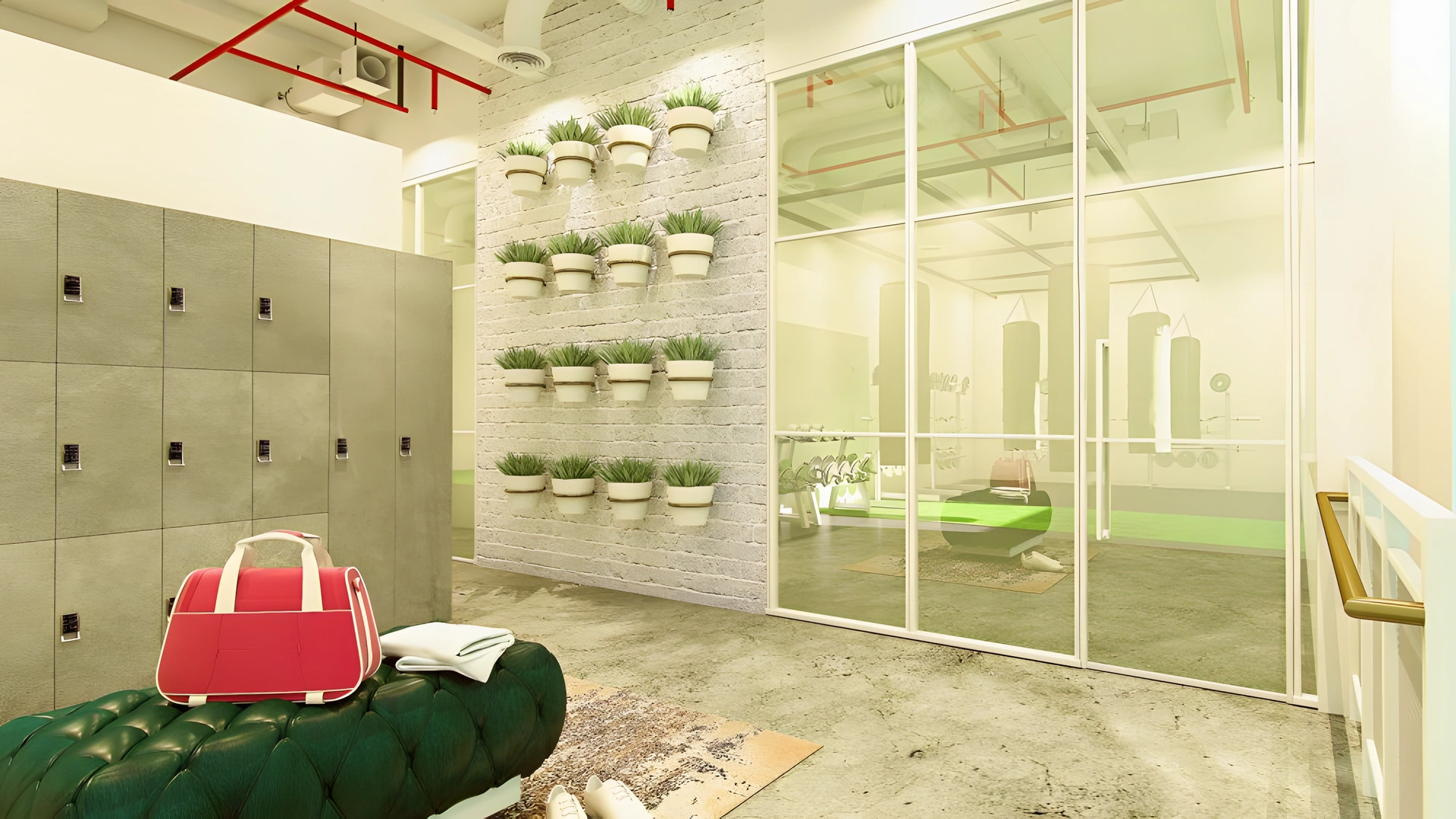 With a design inspired by New York warehouses, Curvalicious Ladies Gym is reminiscent of NYC loft spaces while maintaining a bright, upscale feel. Brass, white steel, and various raw materials such as rough concrete flooring and white brick walls flow harmoniously with lush interior furnishings; leather and velvet finishes add an understated elegance and strategic pops of color to an industrial space. We created a fun and inviting fitness haven for a young, creative clientele, injecting color, and heart-pumping motivation with graffiti art on the walls of the gym. And because the functionality is also paramount, Curvalicious is a mobile space by design. With careful space planning, we integrated foldable partitions that allow merging two studios into one large area to accommodate major workout events. True to the Curvalicious brand concept, it’s a stylish and inspirational environment designed to give women wings to fly.
